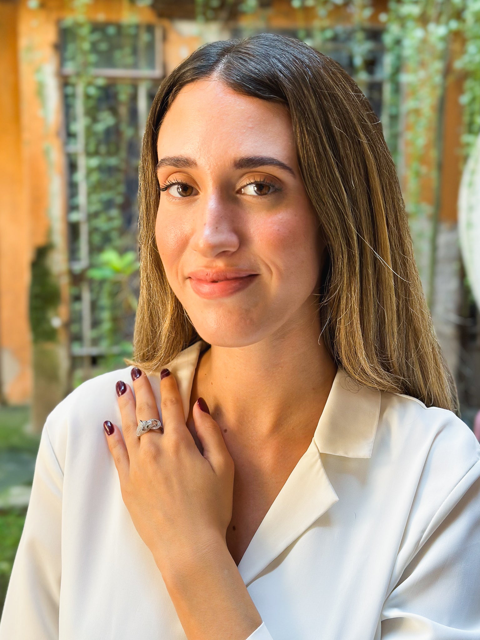 Il gioiello, scolpito nei minimi dettagli, è impreziosito da una pioggia di zirconi bianchi luminosissimi che donano al gioiello un’intensa brillantezza.