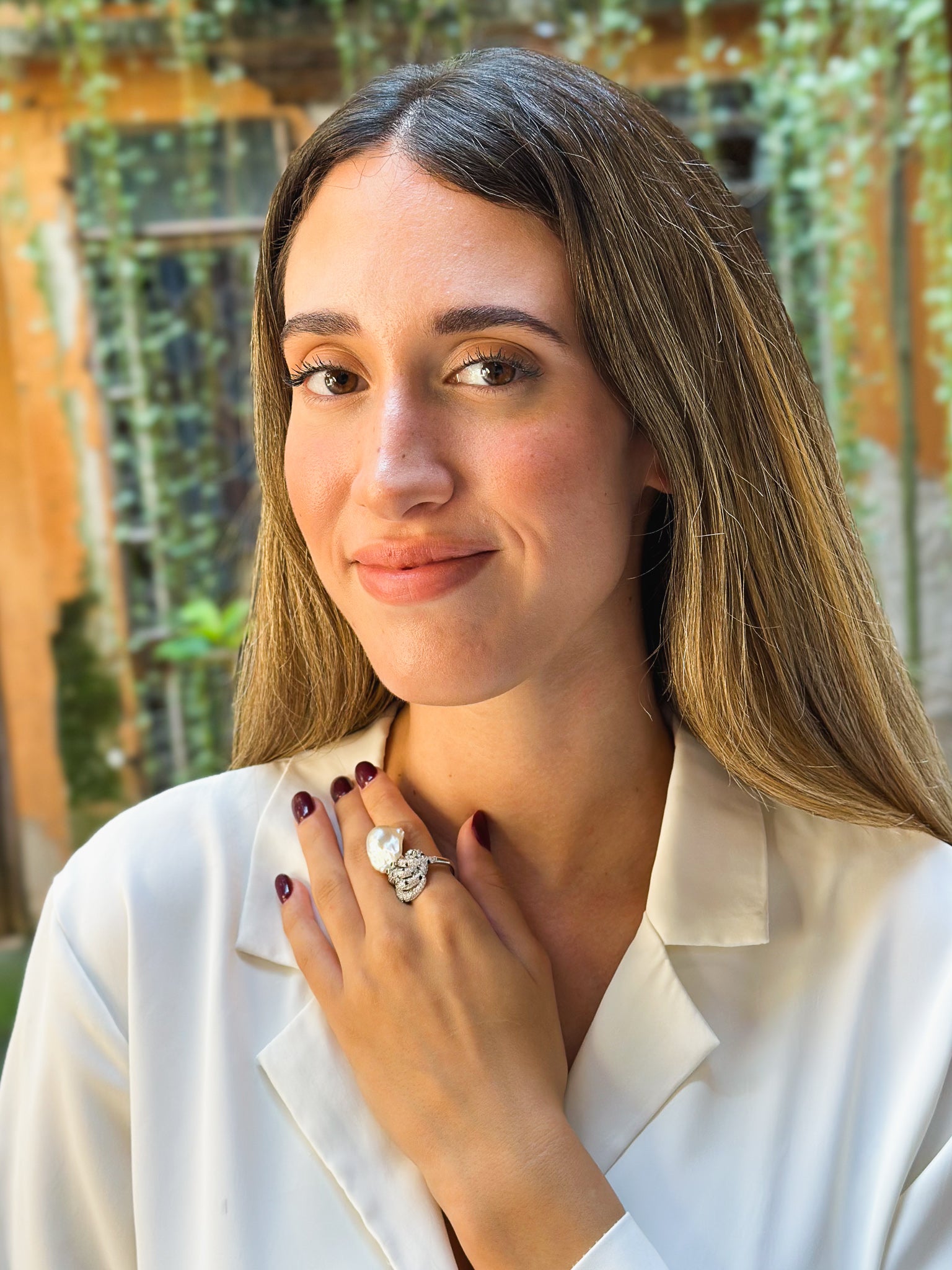 La montatura è impreziosita da un gioco raffinato di zirconi bianchi e neri, che donano luce e profondità al gioiello, mentre una perla barocca – naturalmente irregolare e unica – diventa la protagonista assoluta, conferendo un tocco sofisticato e artistico.