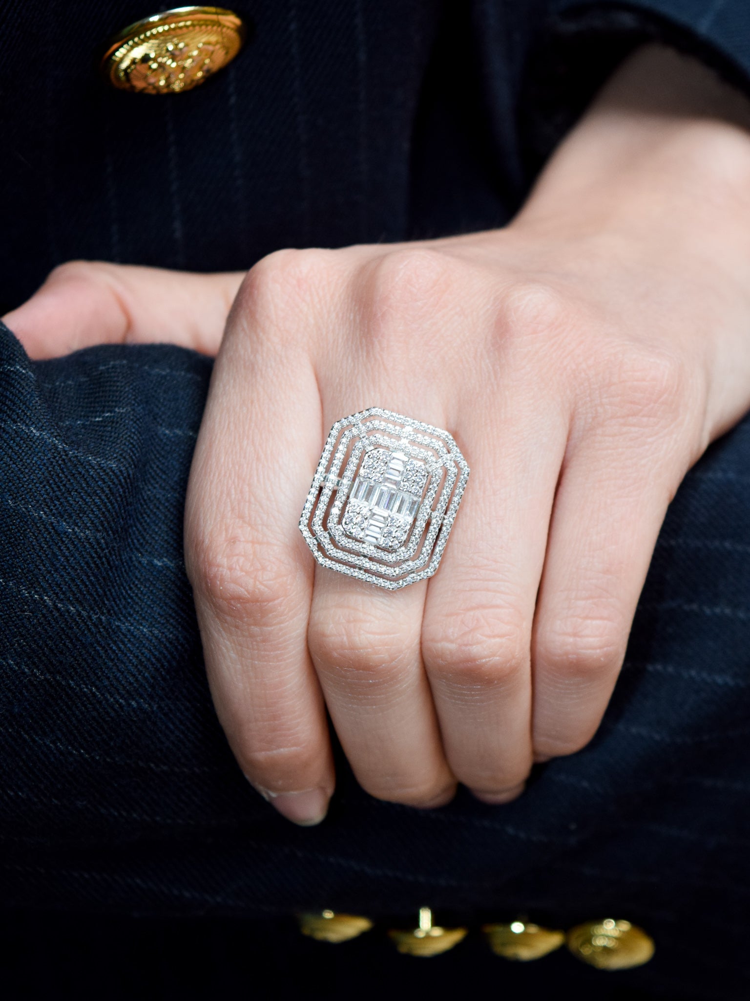 Anello in argento 925 con finitura rodio, dal design geometrico deciso e contemporaneo. Le linee pulite e le forme geometriche rendono questo gioiello raffinato e moderno!