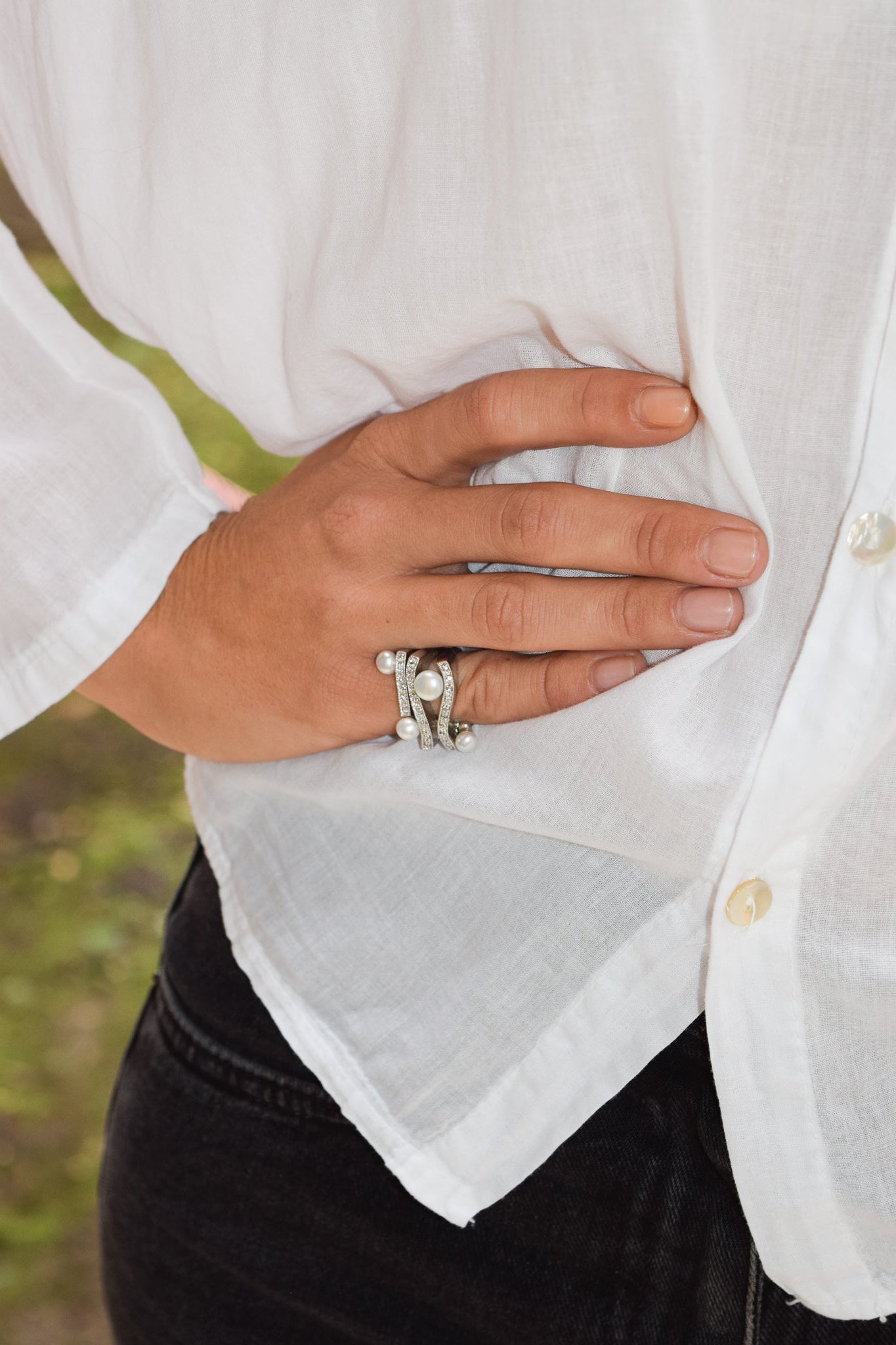 Questo anello vintage anni ’80 unisce il rigore del design essenziale alla morbida luminosità delle perle di acqua dolce.