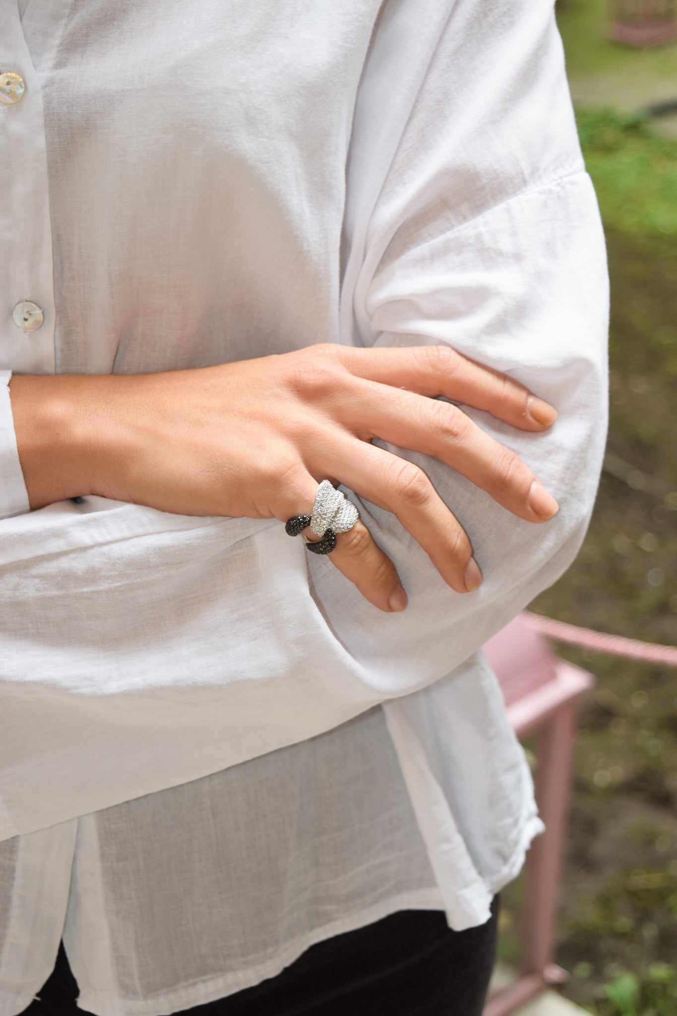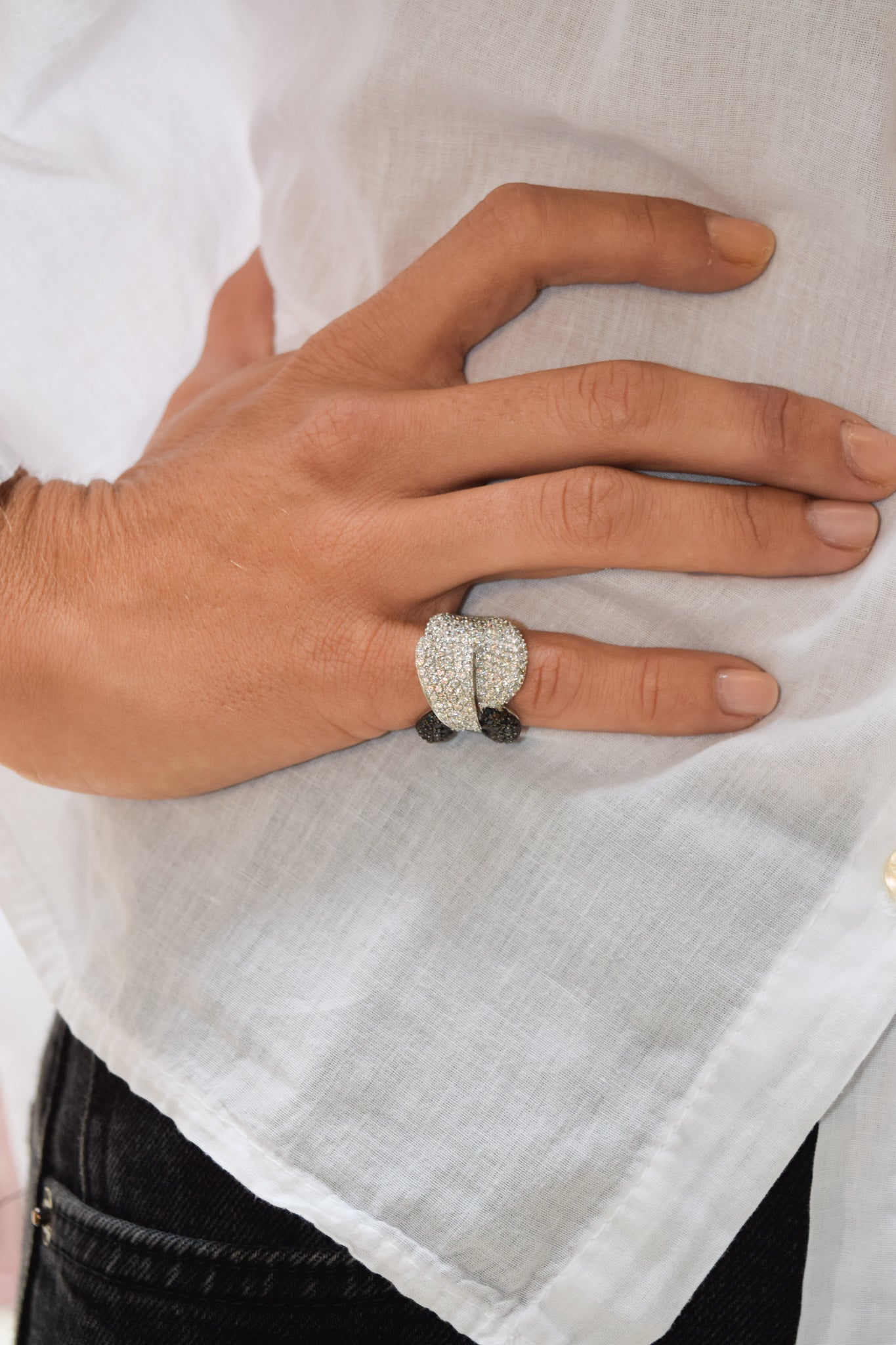 Il contrasto cromatico tra bianco e nero riflette il perfetto equilibrio tra luce e ombra, ideale per chi cerca un gioiello che racconti una storia di dualità e carattere.