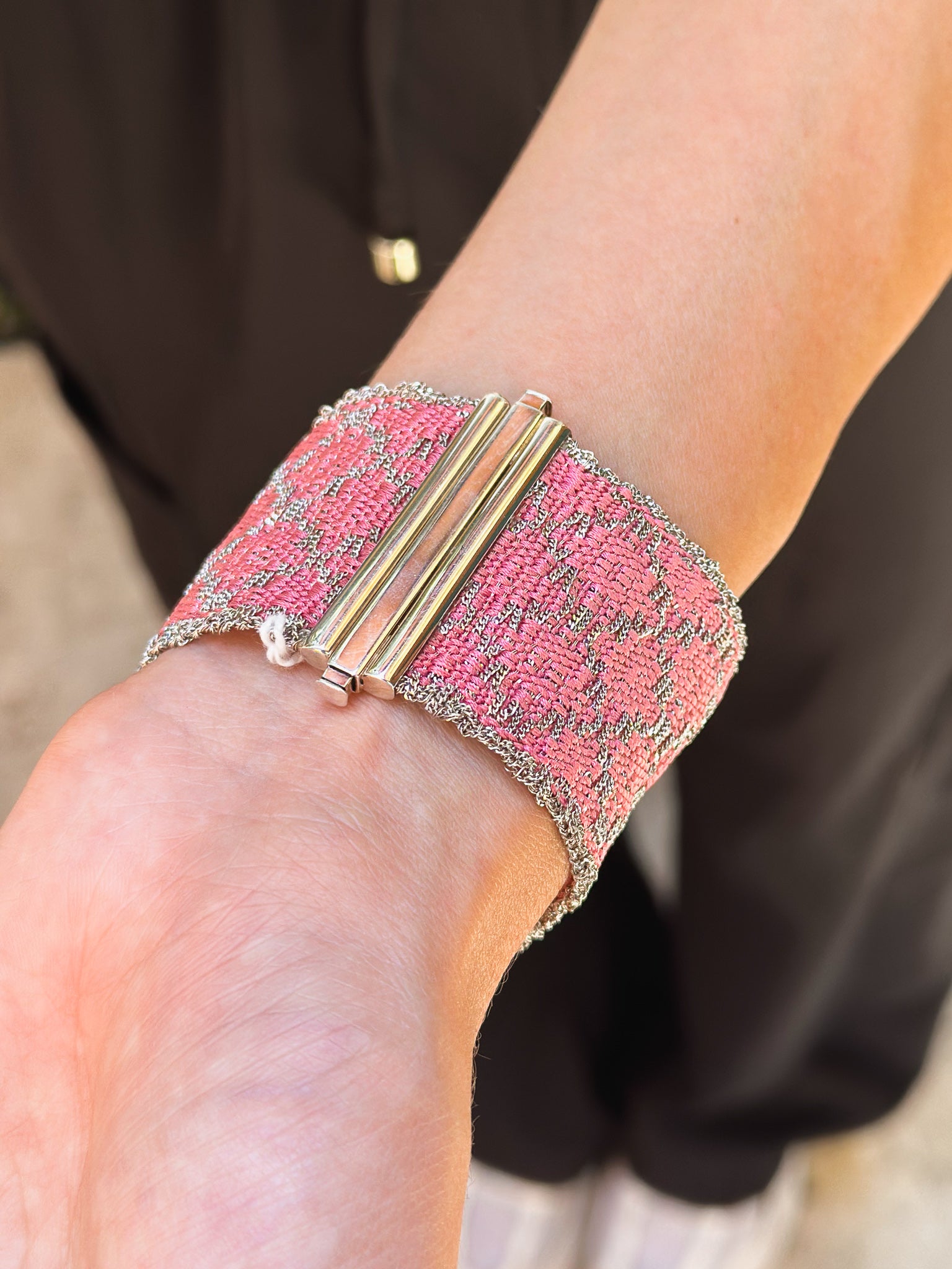 Un gioiello dal design unico e dall’eleganza luminosa, realizzato interamente a mano. Questo bracciale unisce la preziosità dell’argento 925 rodio alla leggerezza dei fili di seta rosa, intrecciati in una raffinata lavorazione a trama e ordito.