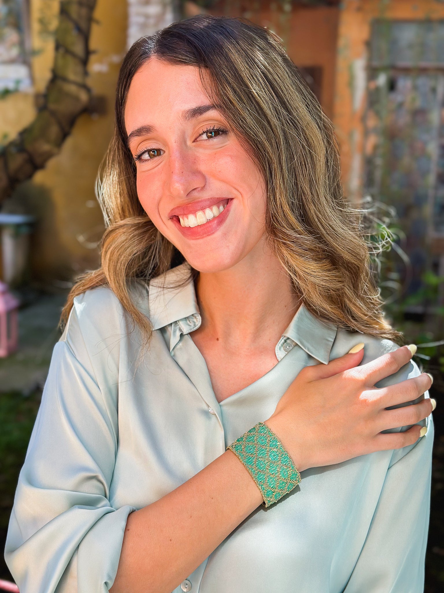 Un gioiello dal design distintivo e dall’eleganza naturale, realizzato interamente a mano. Questo bracciale unisce la preziosità dell’argento 925 placcato oro giallo 18kt alla leggerezza dei fili di seta verde, intrecciati in una sofisticata lavorazione a trama e ordito.