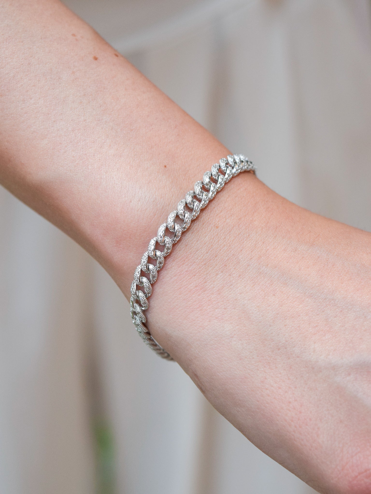 Realizzato in argento 925 con finitura rodio, è completato da una chiusura a cassetta con sicurezza a otto, per un tocco di alta gioielleria e massima tenuta.