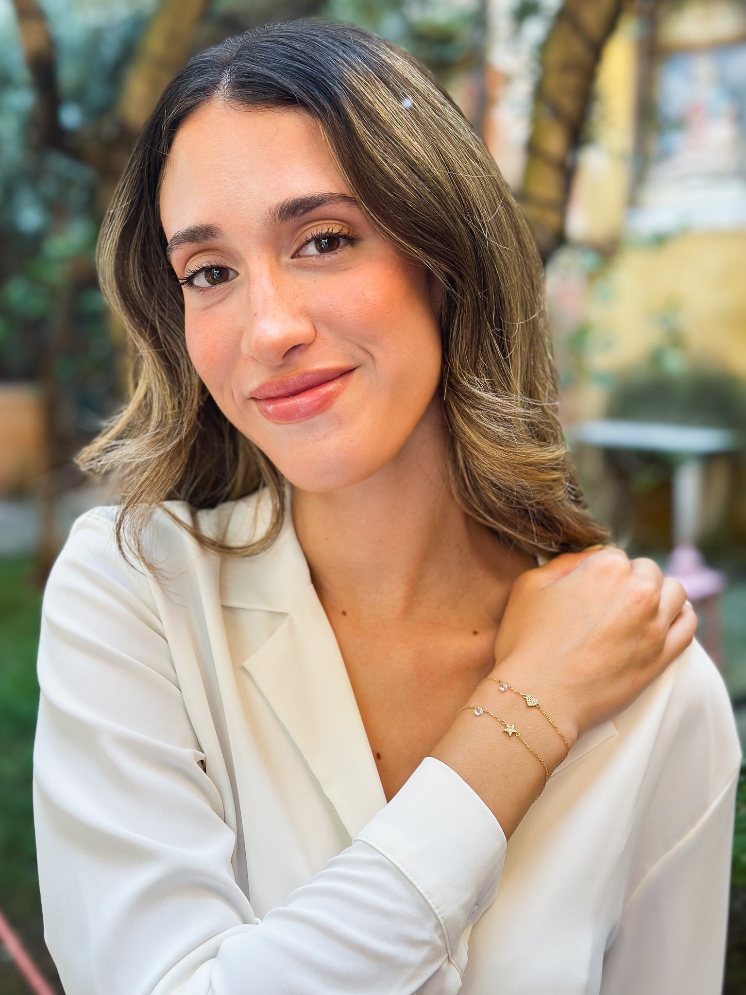 Il design è impreziosito da un charm a scelta tra stella o cuoricino, decorato con un brillante pavé di zirconi e dettaglo di zirconi a bandiera, quest'ultimo incastonato senza montature, per una luce ancora più intensa e naturale.