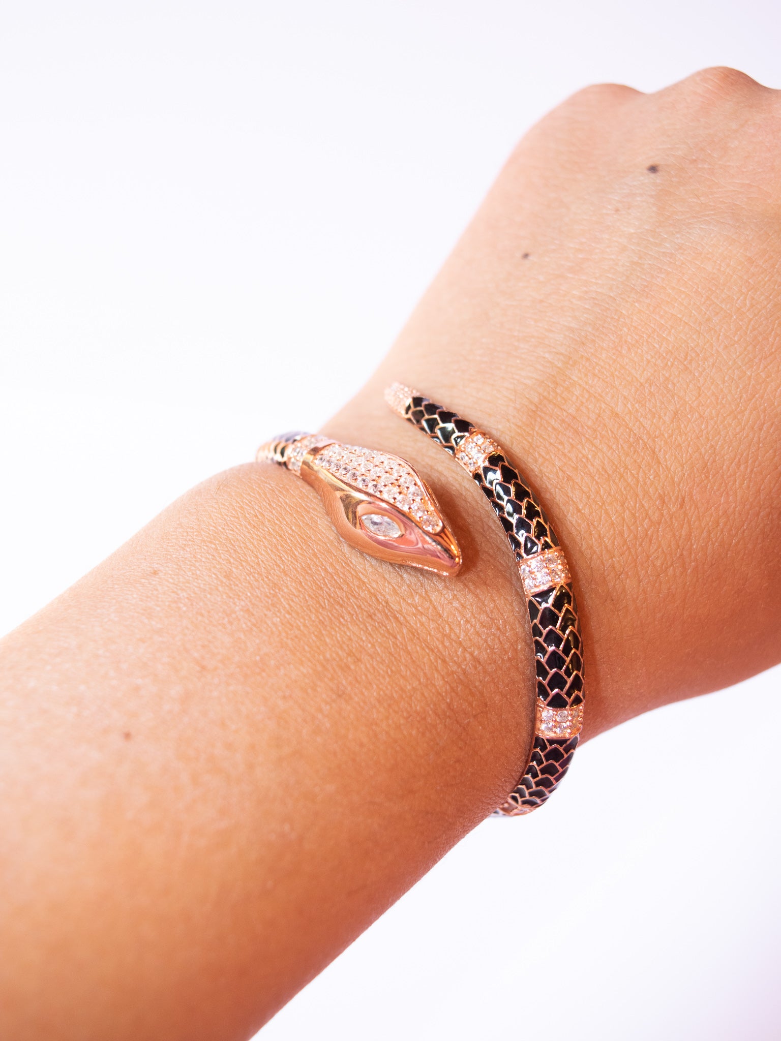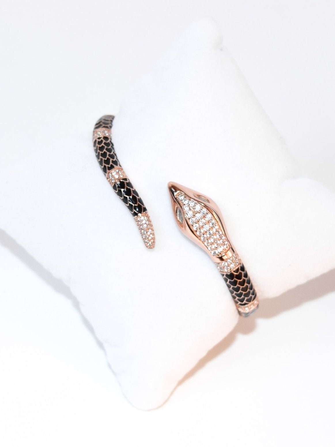 Il bracciale Vipera è realizzato in argento 925 placcato oro rosa 18kt con zirconi incastonati e smalto nero.