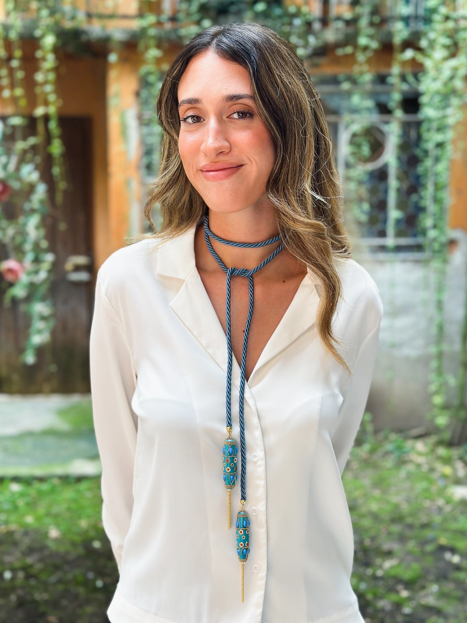 Delicata e versatile, questa collana in Torsone di seta color Azzurro aggiunge un tocco di luce e freschezza a qualsiasi outfit.