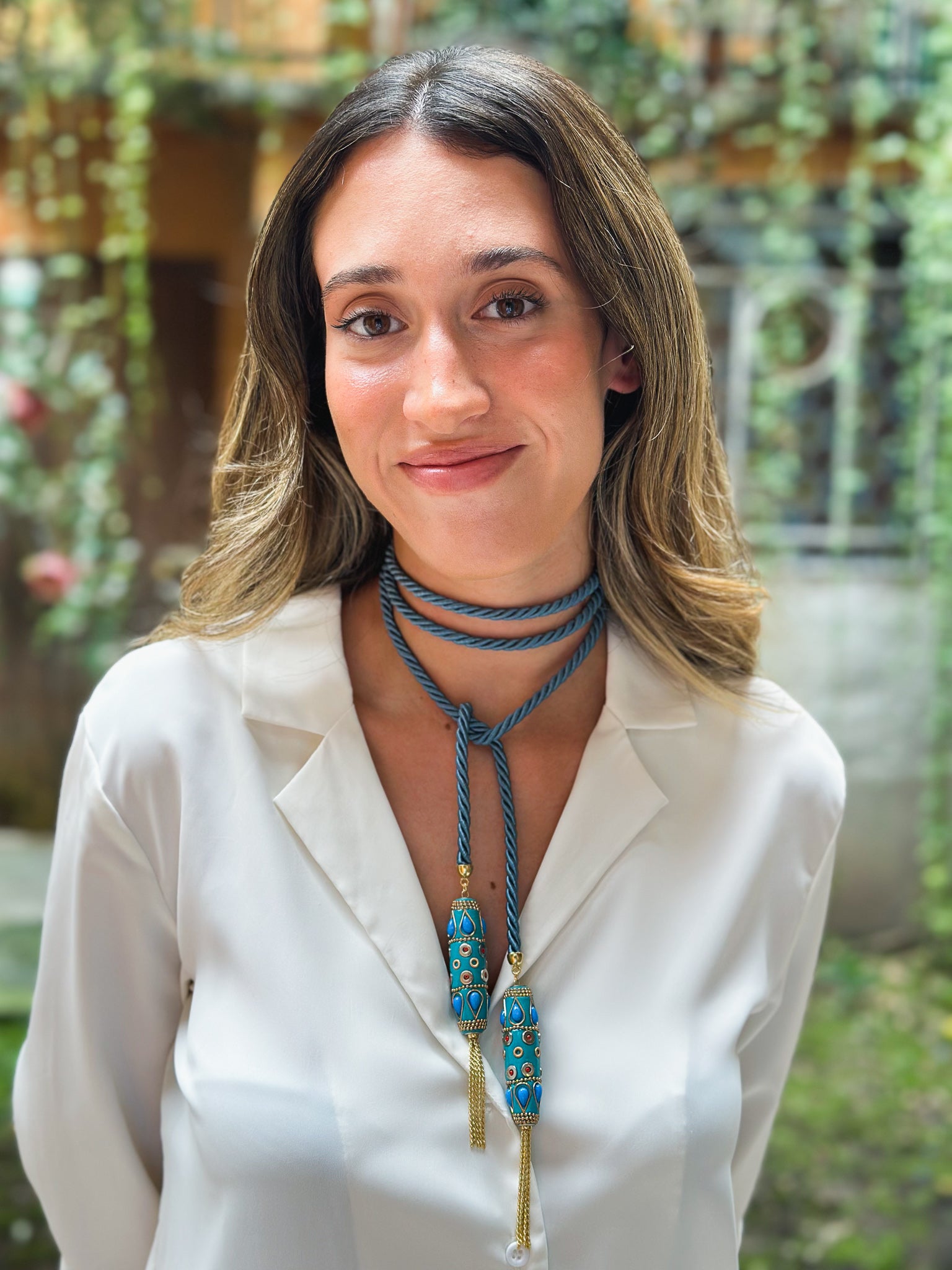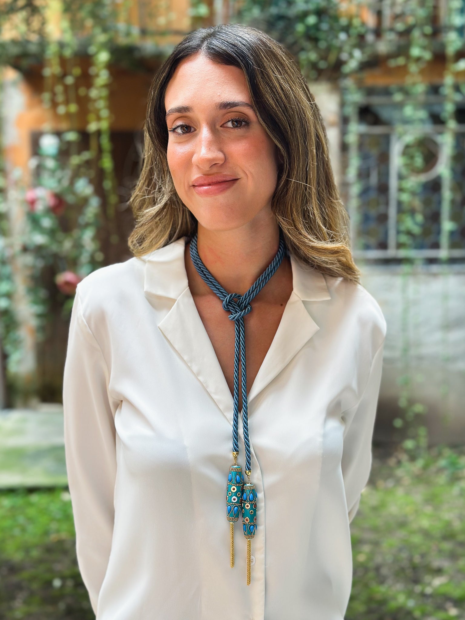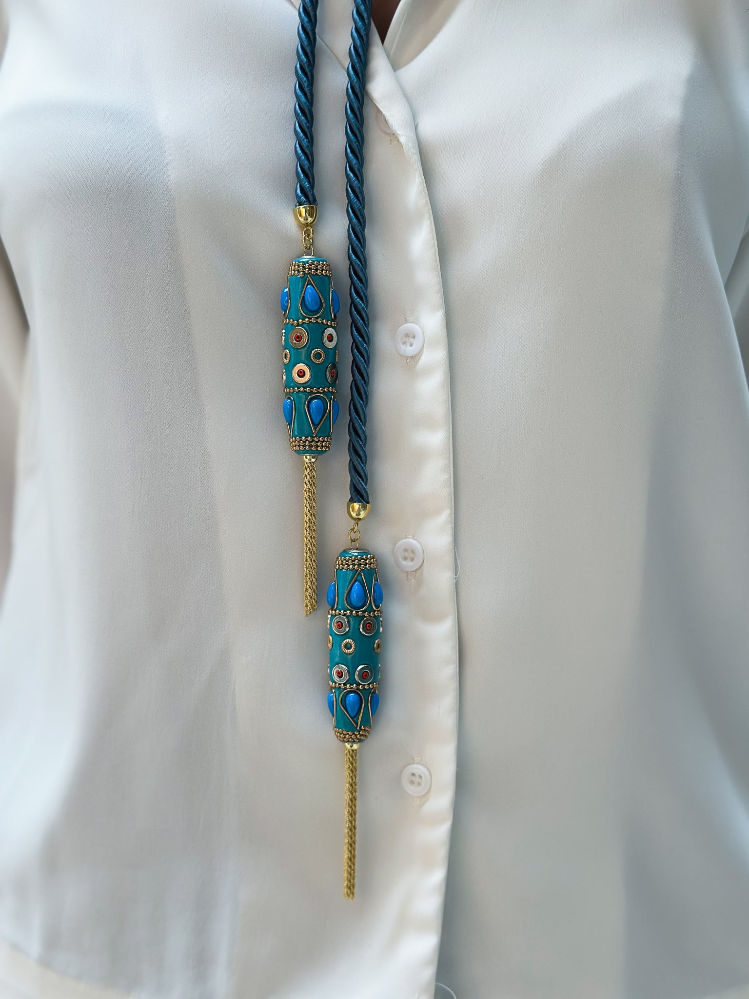Collana in Torsone di seta Azzurro con dettagli in Argento smaltato, pietre colorate e nappine