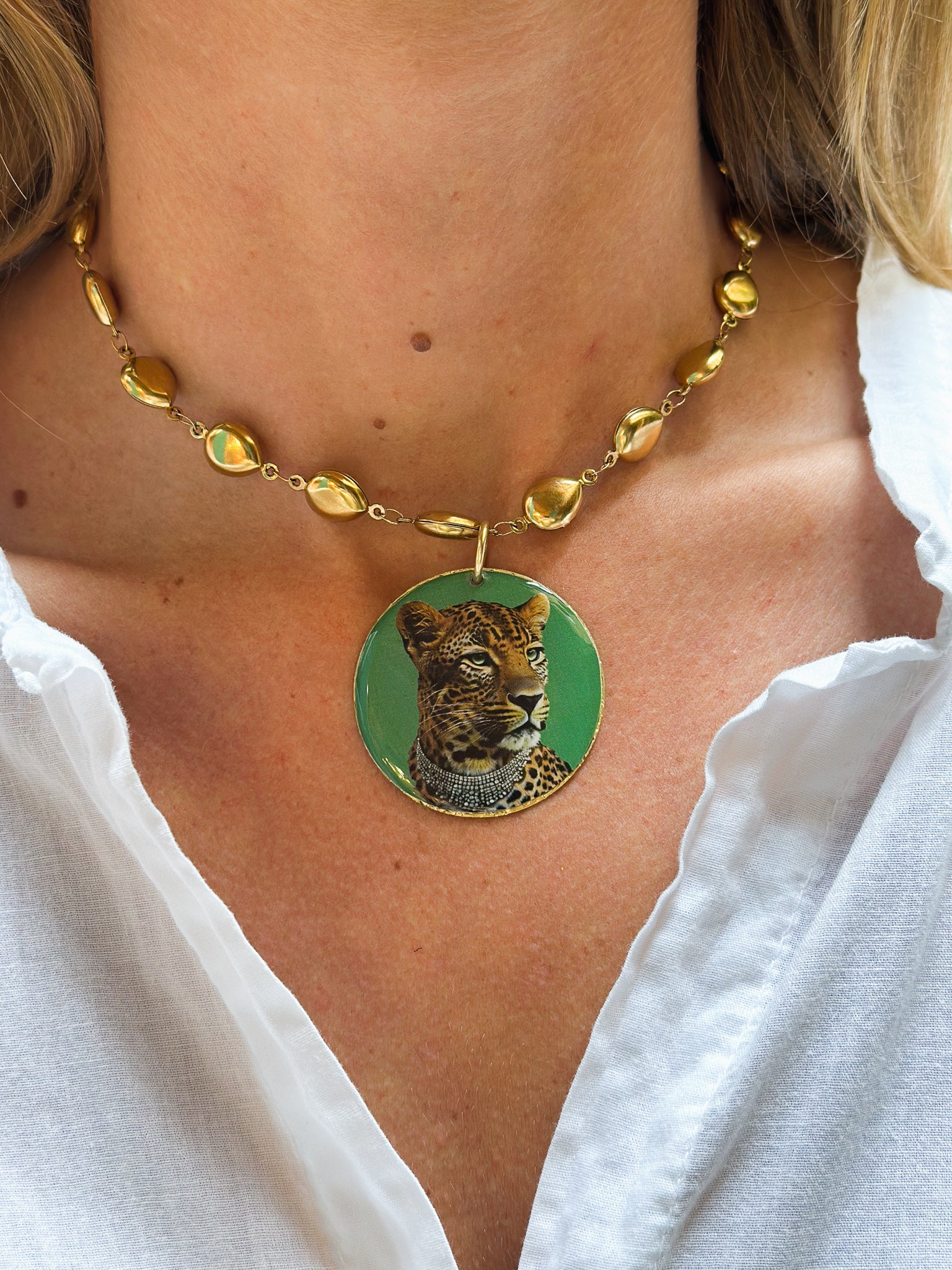 Un gioiello dal carattere forte e deciso: questo girocollo in argento 925 placcato oro giallo 18kt è composto da una sequenza di pepite dorate che donano movimento e luce, impreziosito da un pendente che rappresenta un Ghepardo ingioiellato su sfondo verde intenso, simbolo di eleganza e potenza.