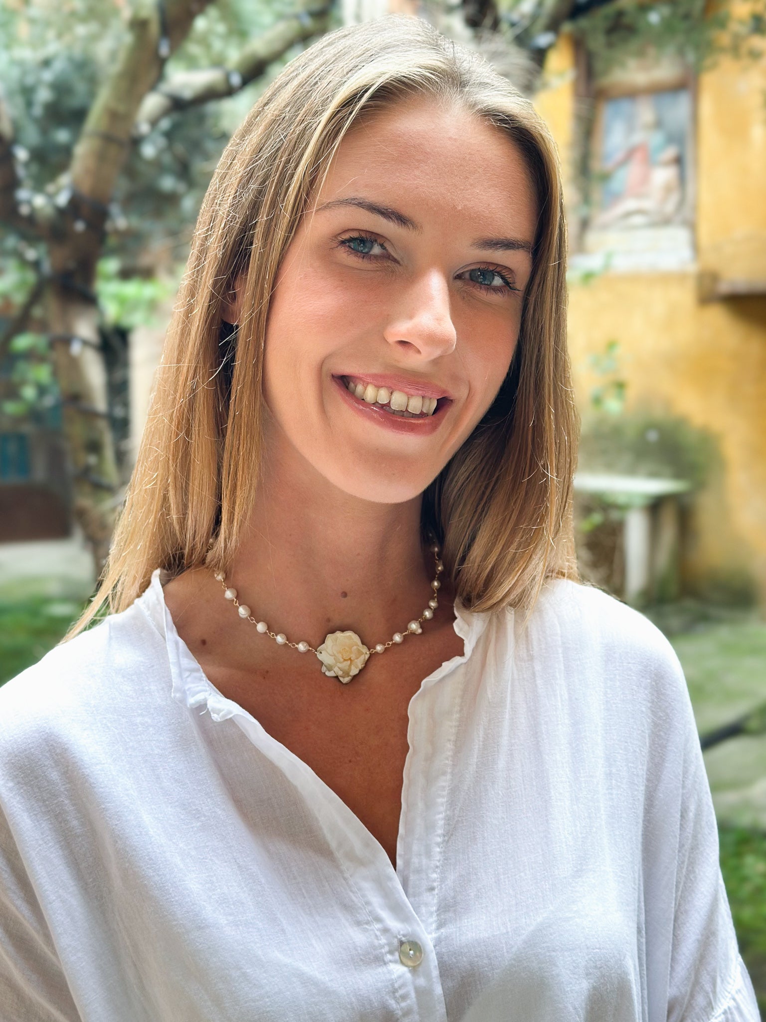 Un gioiello raffinato che unisce la purezza delle perle di acqua dolce alla bellezza senza tempo della camelia, fiore simbolo di eleganza, discrezione e amore duraturo.