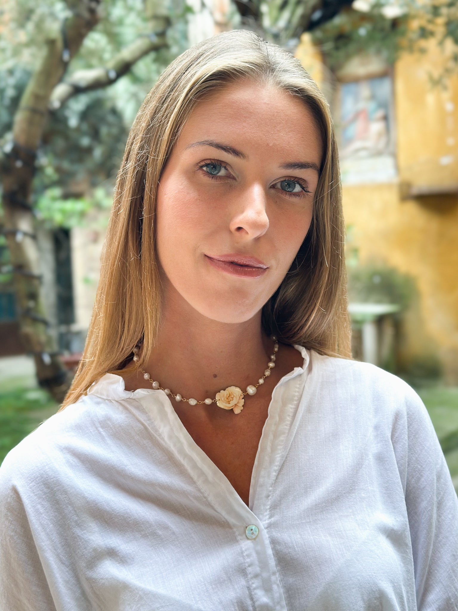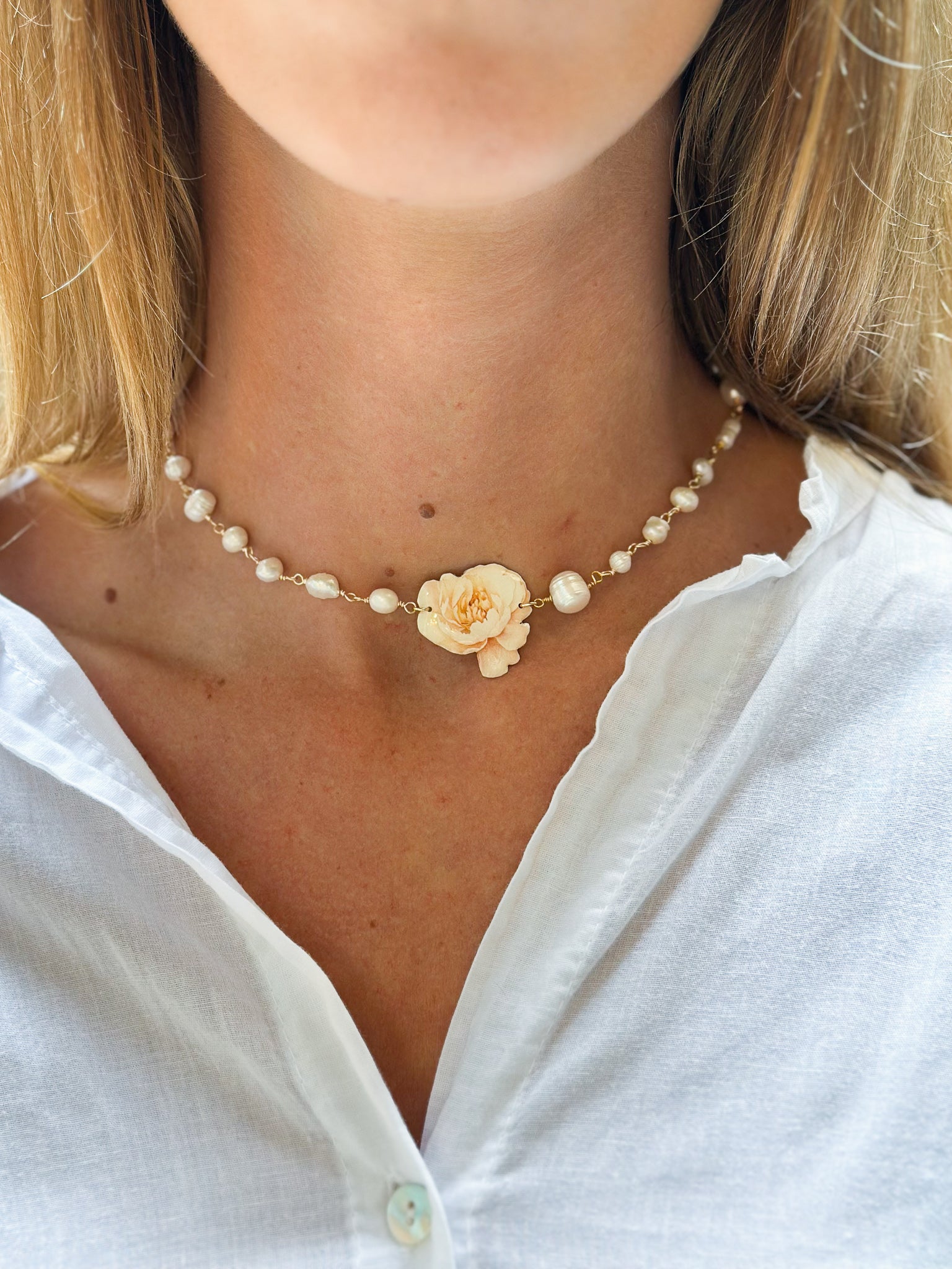Un gioiello che parla di luce, armonia e delicatezza. Questo girocollo con perle di acqua dolce è impreziosito da un raffinato pendente a forma di peonia nei toni giallo crema, simbolo di eleganza, positività e bellezza che sboccia con dolcezza.