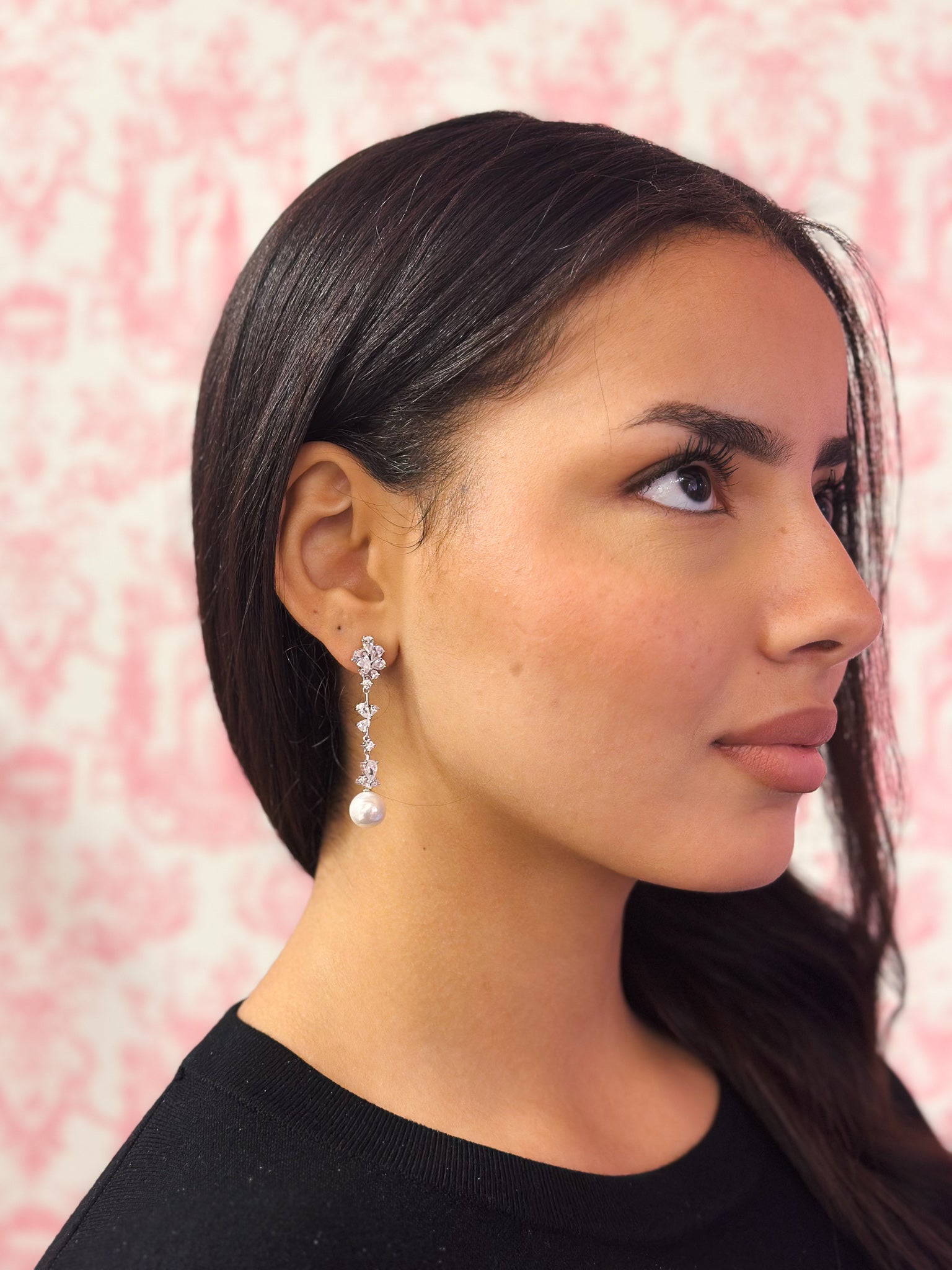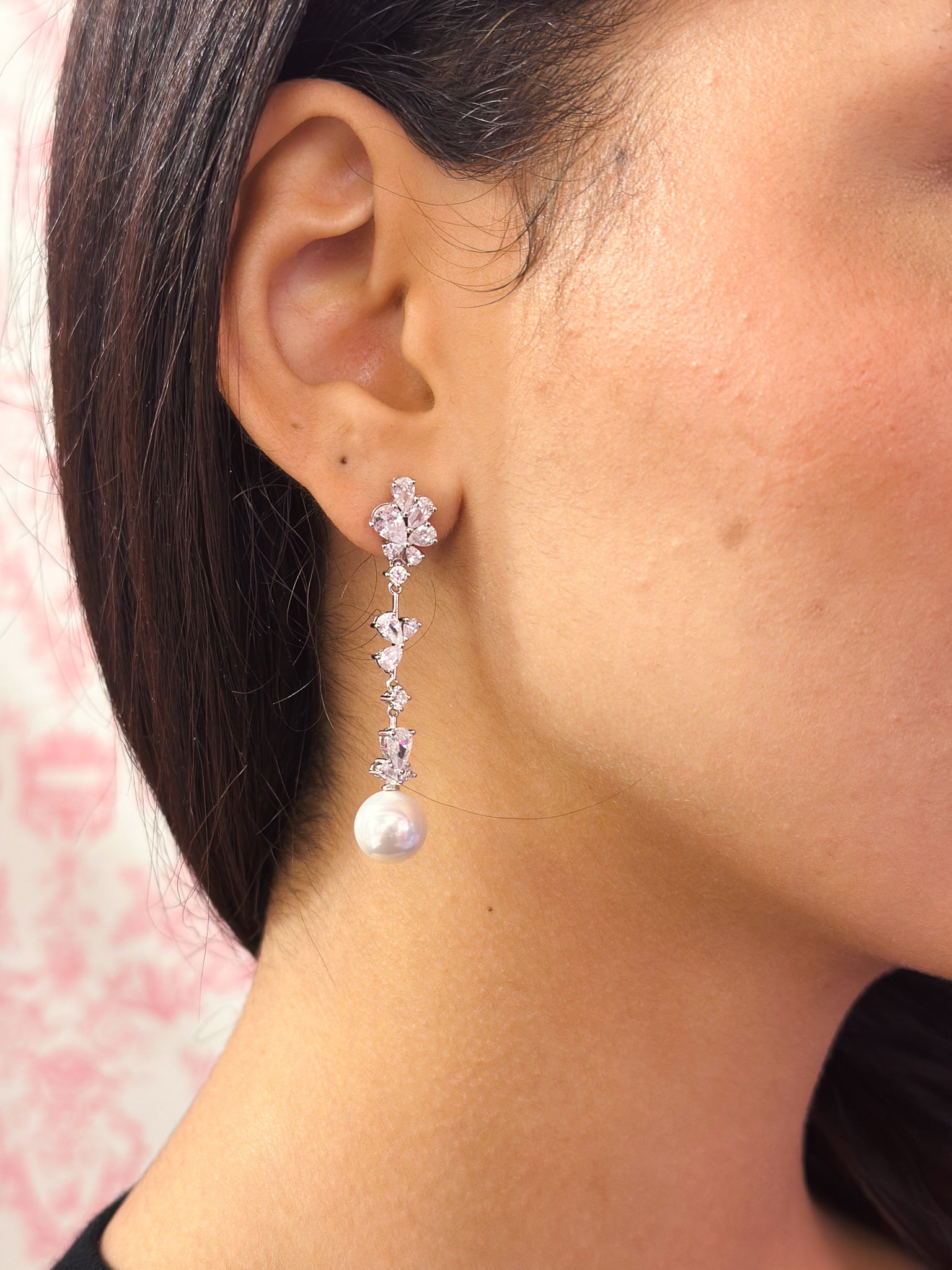 Orecchini in argento 925 rodio, perla di acqua dolce e zirconi incastonati