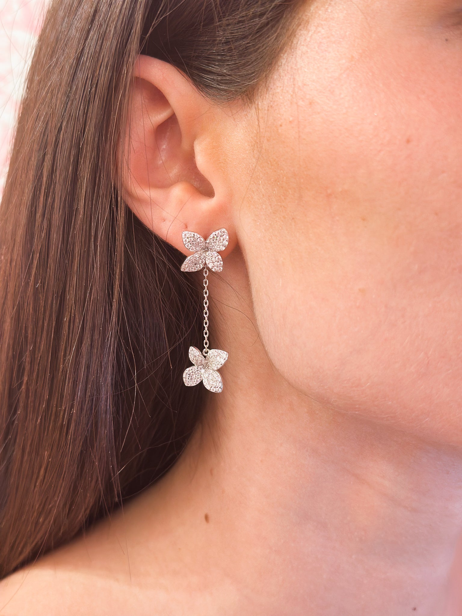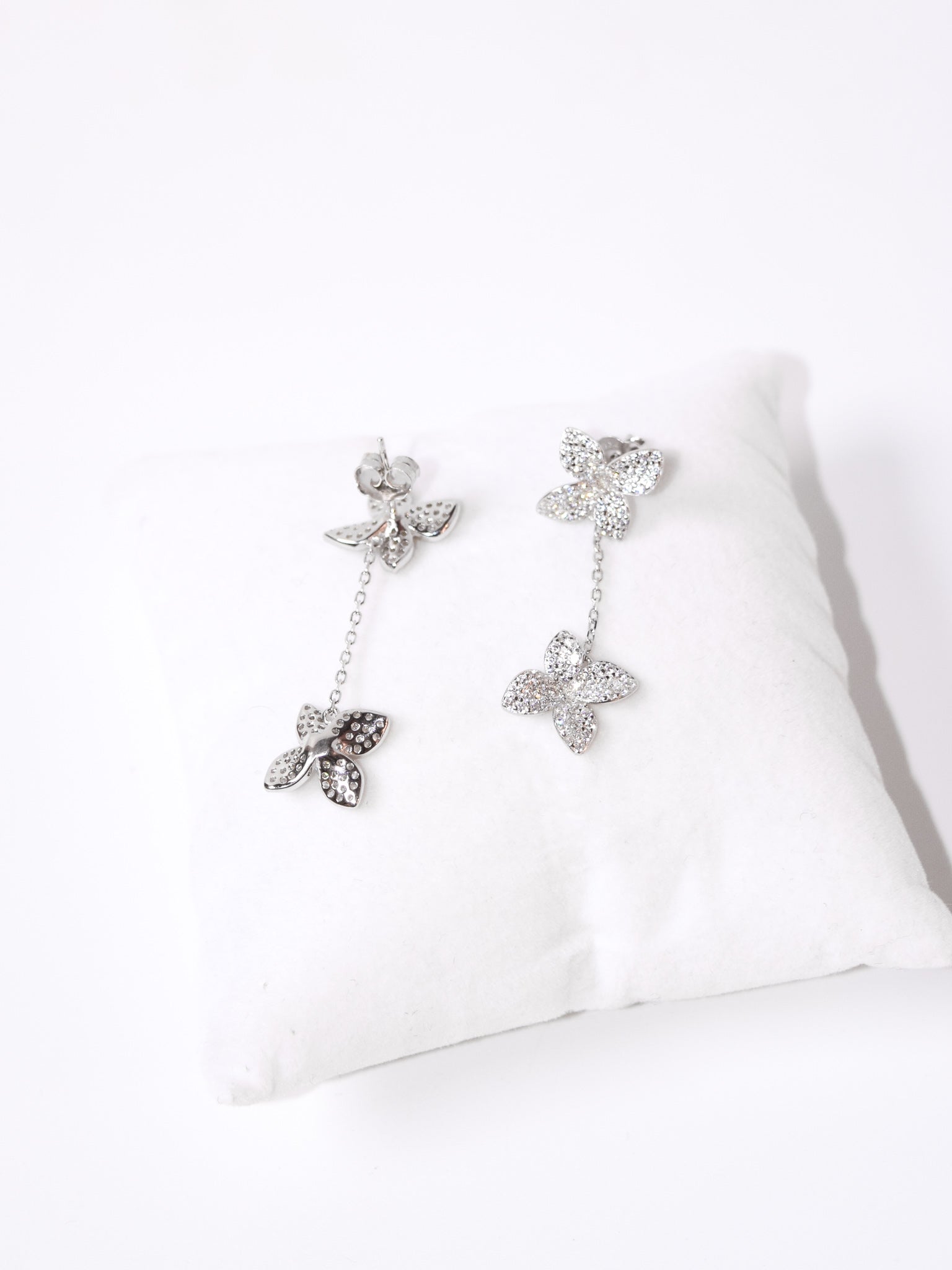 Eleganza in movimento: questi orecchini in argento 925 rodiato si distinguono per il loro design sofisticato e dinamico, che unisce il fascino floreale alla brillantezza contemporanea. La parte superiore è caratterizzata da un fiore delicato, incastonato con zirconi che catturano la luce con grazia.