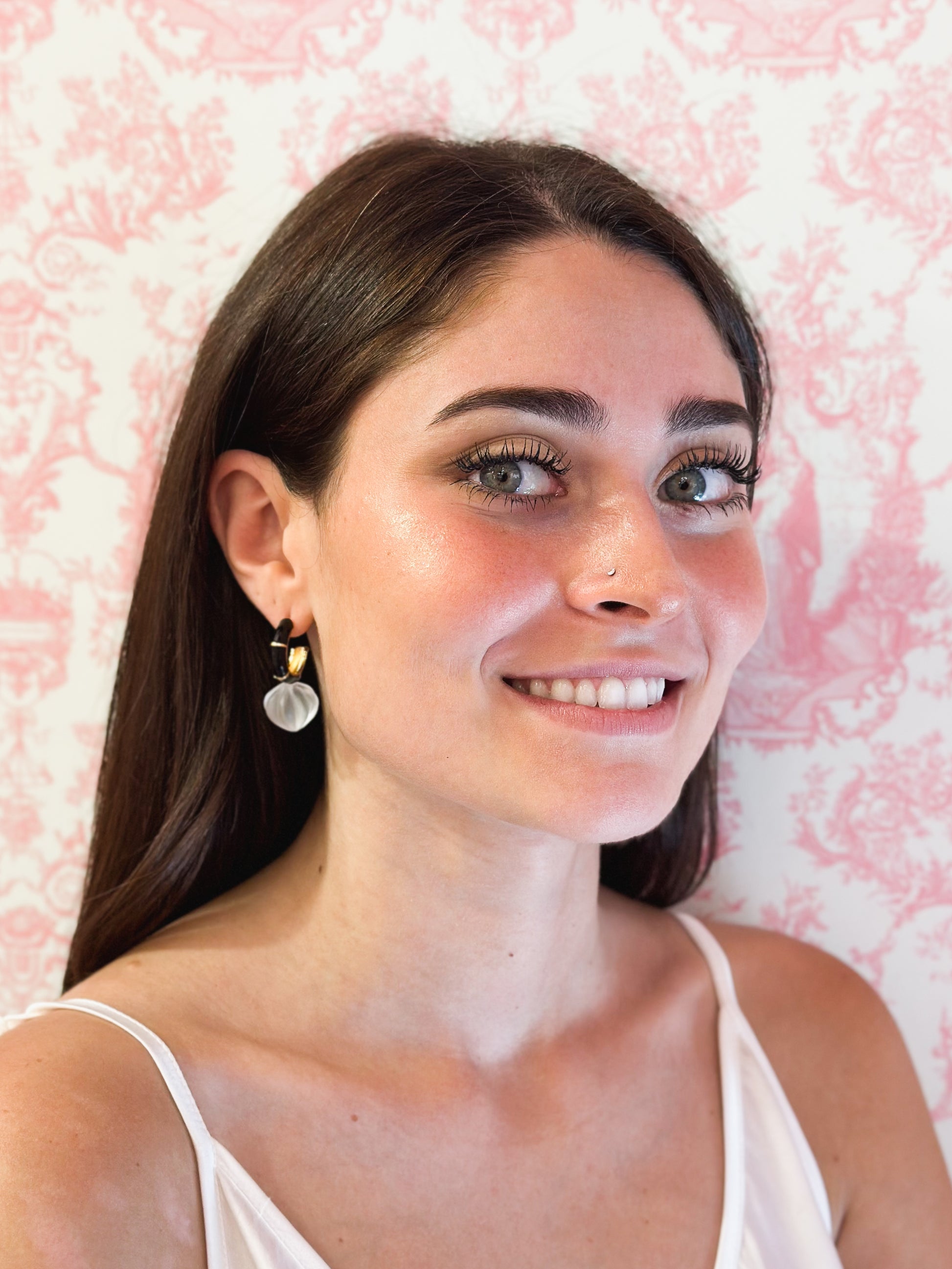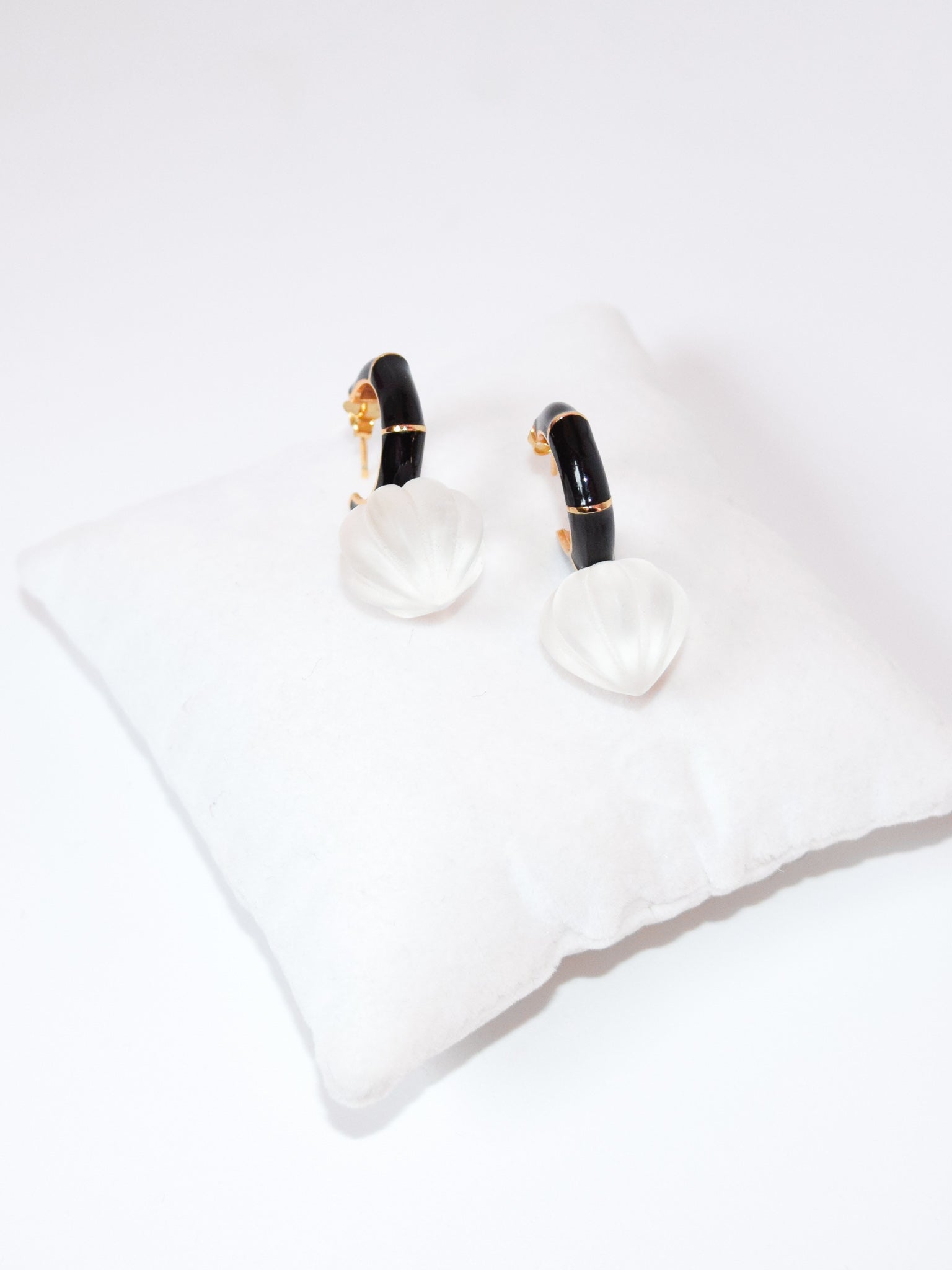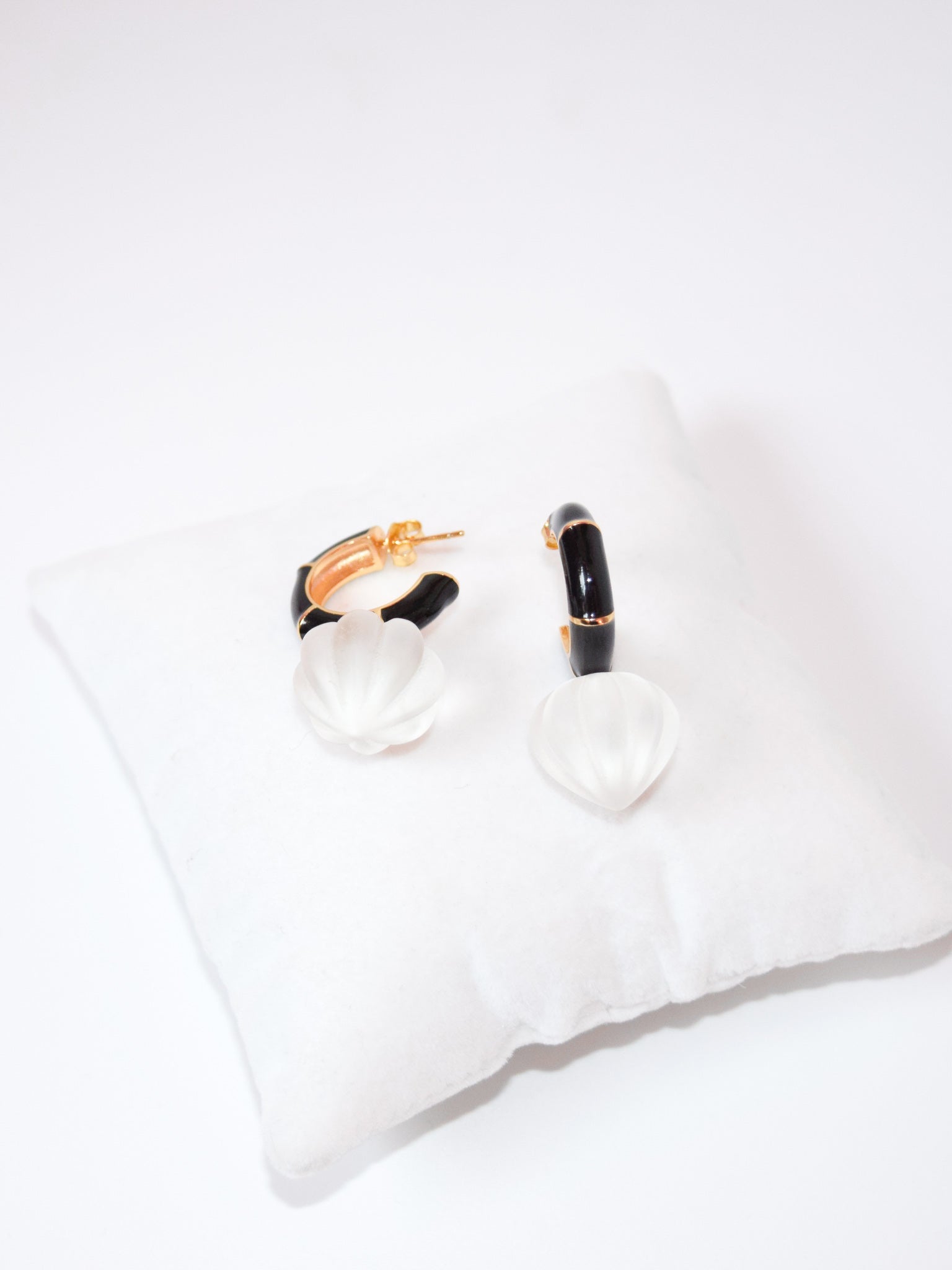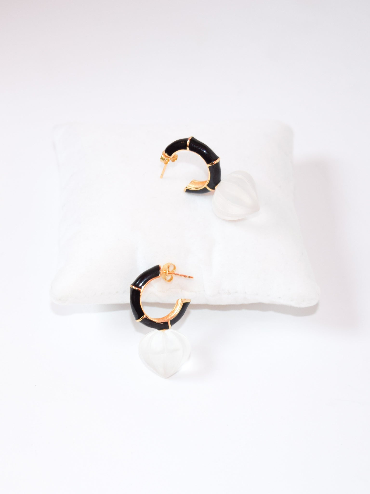 L'orecchino Denise è realizzato in argento 925 placcato oro giallo 18kt con smalto nero e pendente in Cristallo di Rocca, una combinazione audace e sorprendente!