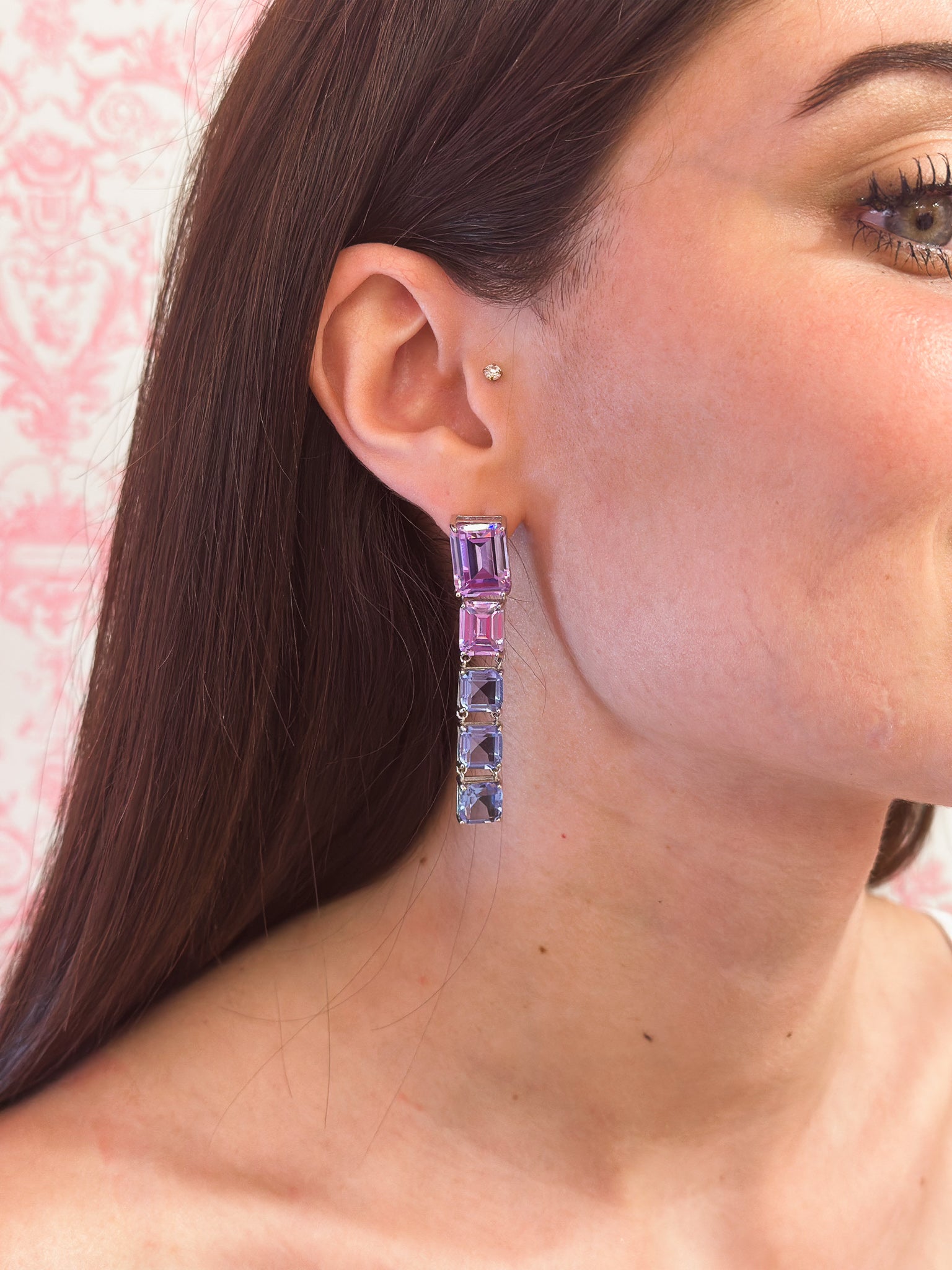 Gli orecchini Gabriella sono realizzati in argento 925 rodio e arricchiti da zirconi colorati nelle sfumature del viola e del blu, che danno vita a una composizione elegante e raffinata.