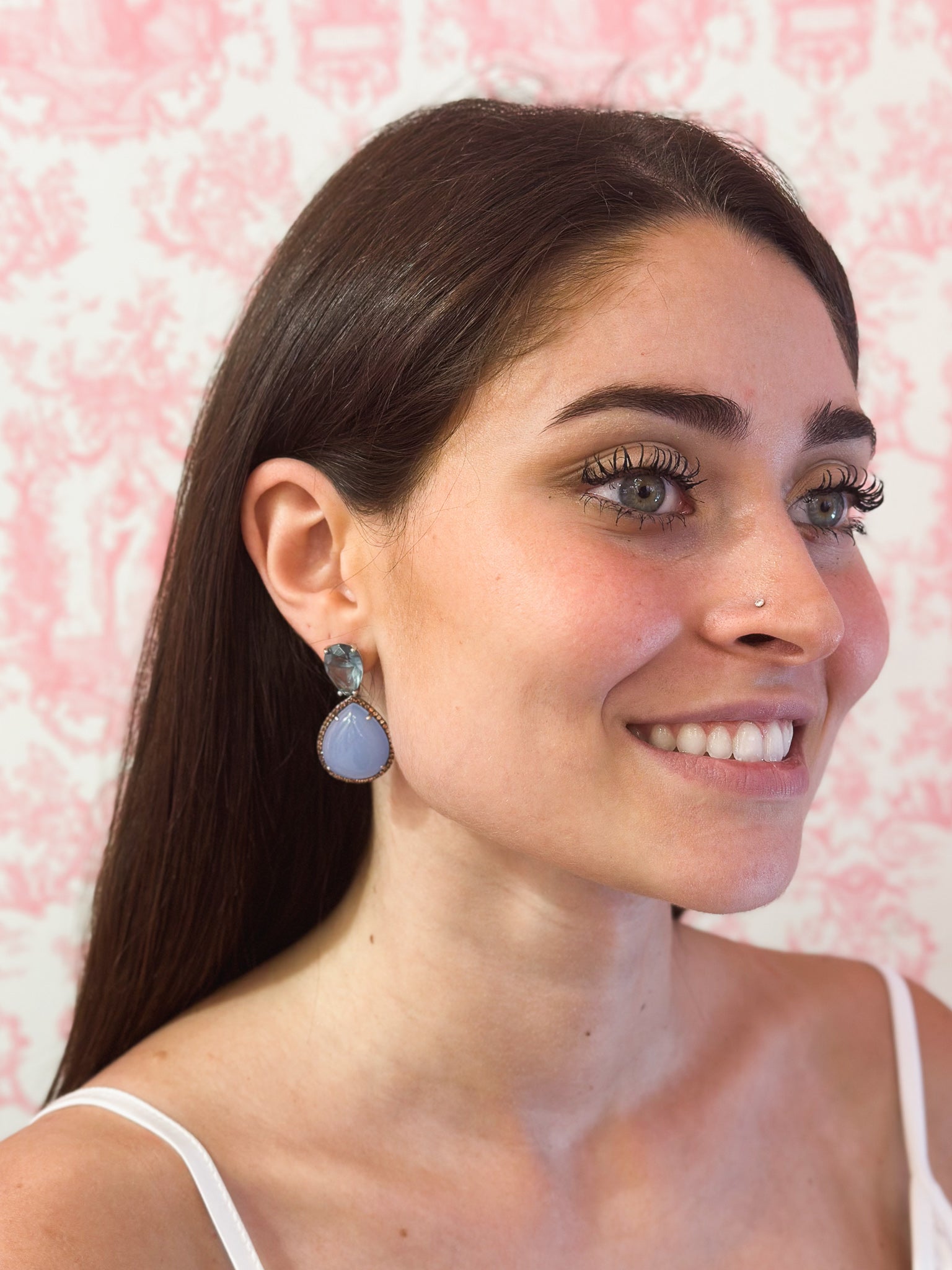 Gli orecchini Lisa sono realizzati in argento 925 con luminosi zirconi che impreziosiscono la composizione ed incorniciano il meraviglioso Calcedonio color celeste.