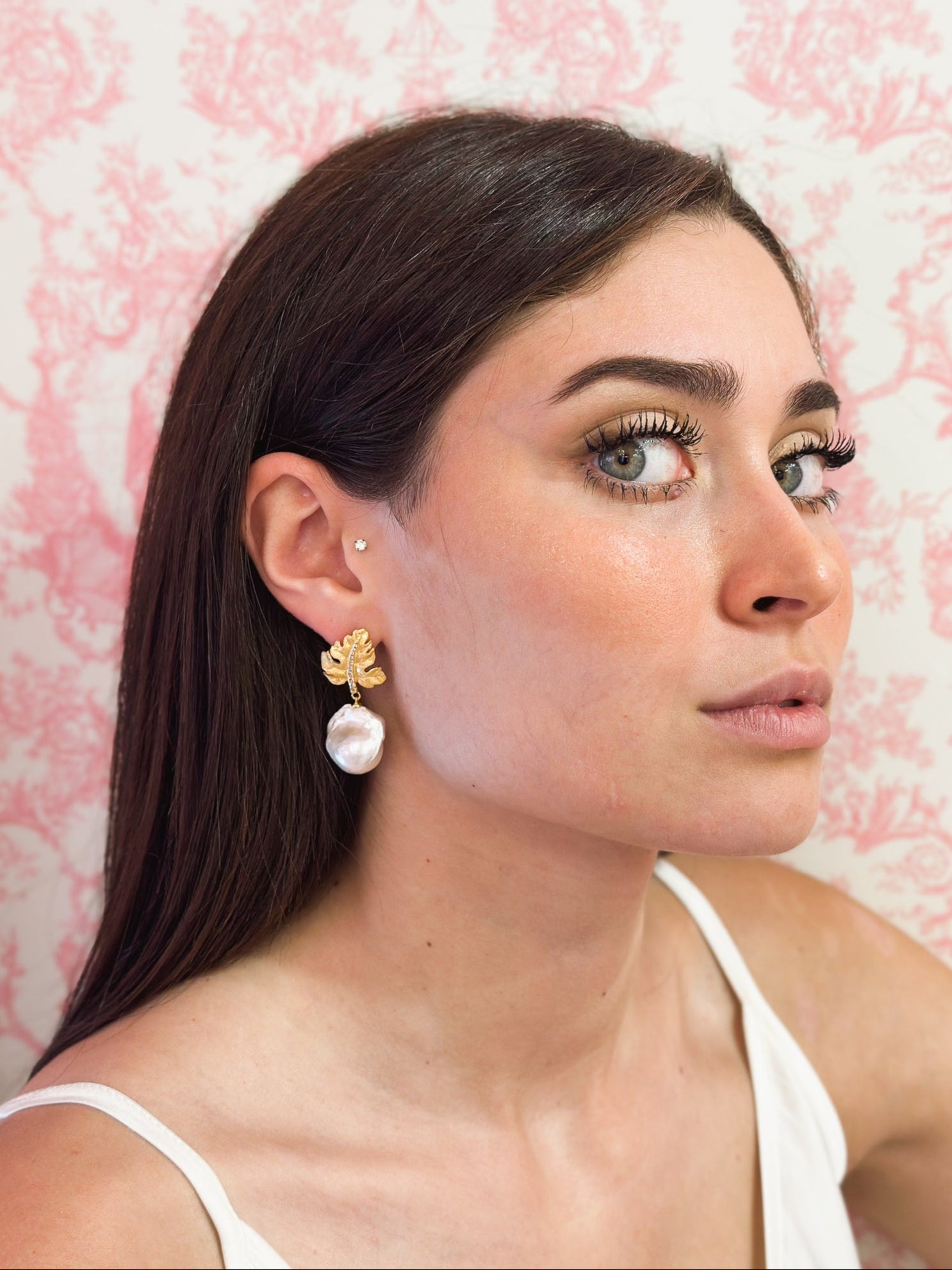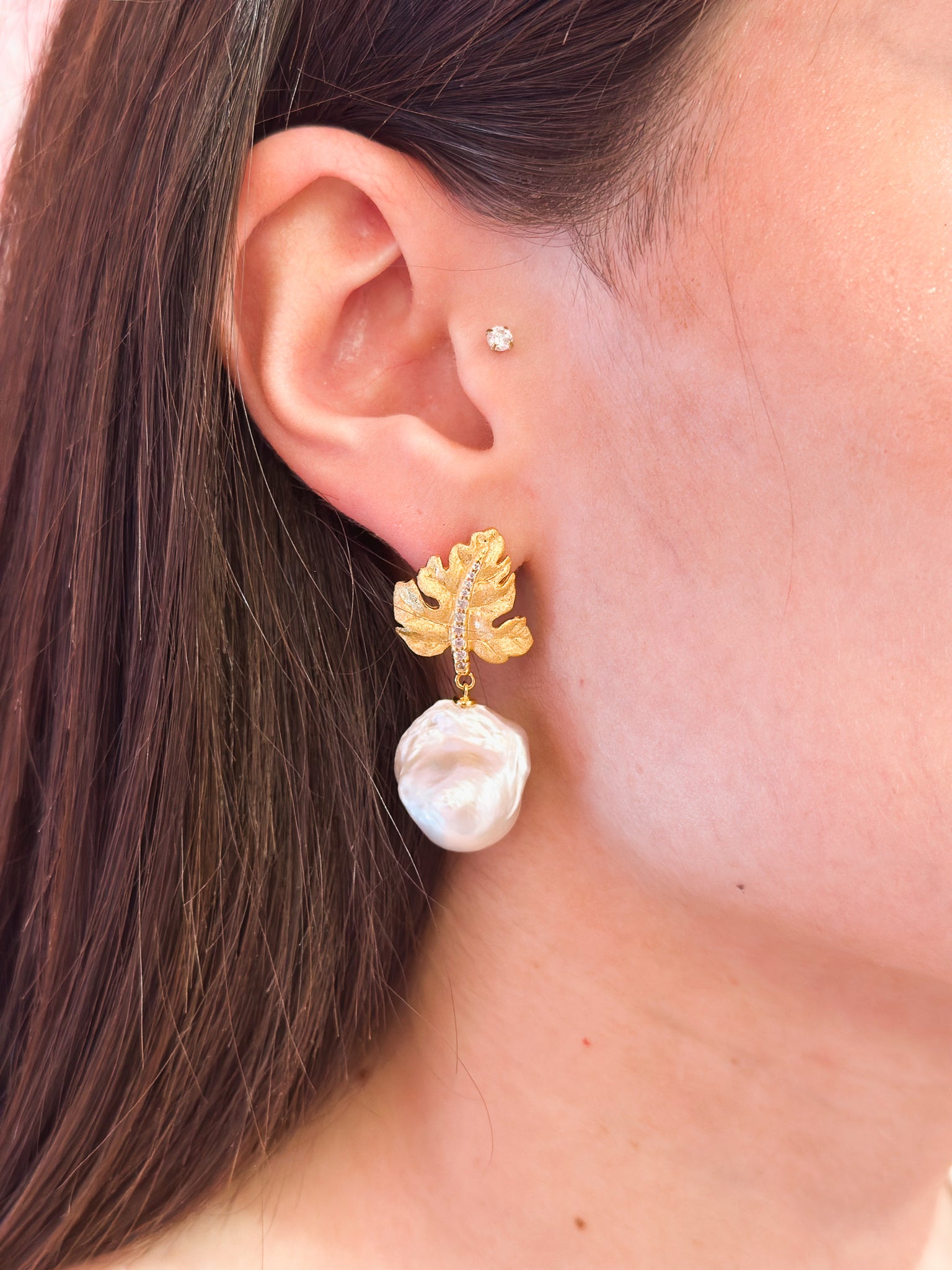 L'orecchino Melania è realizzato in argento 925 placcato oro giallo 18kt, caratterizzato dal design unico della foglia, impreziosita da zirconi incastonati e perla di acqua dolce Barocca.