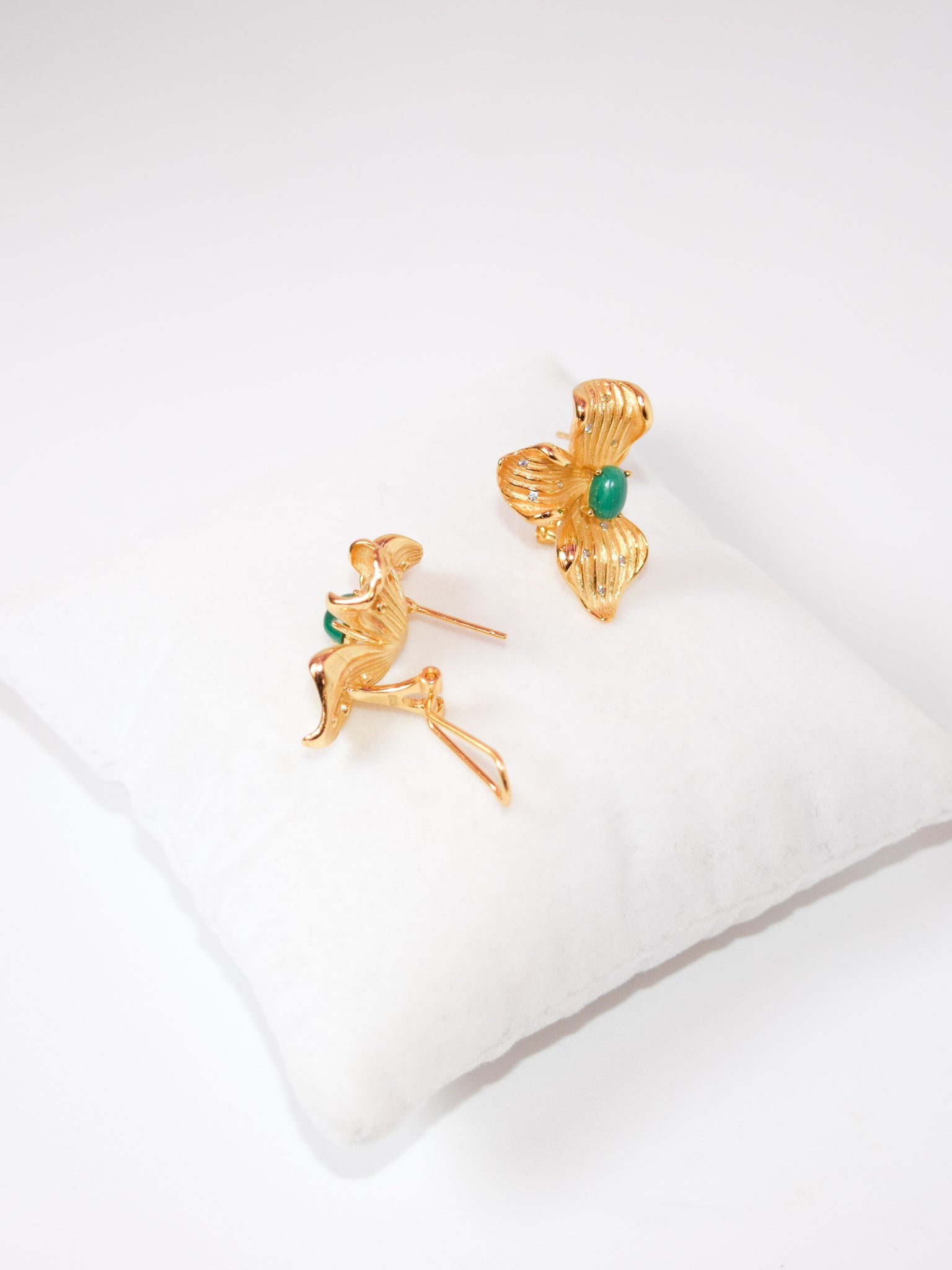 L'orecchino Silvia è realizzato in argento 925 placcato oro giallo 18kt caratterizzato da grandi petali di fiore impreziositi da scintillanti zirconi e centrale in Malachite che dona un tocco di colore al gioiello.