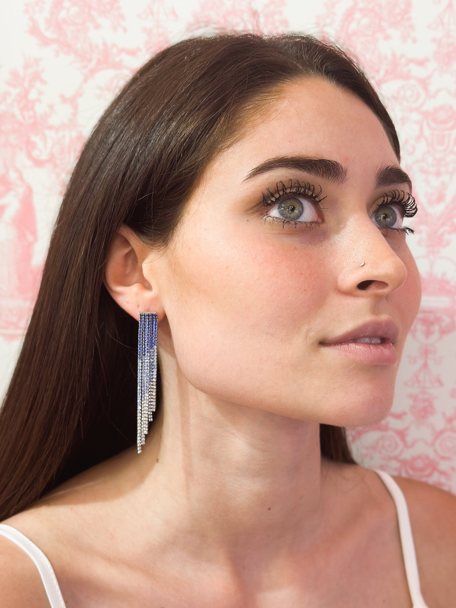 Orecchini Pendenti in Argento Rodiato con Cascata di Zirconi in Degradé Blu e Azzurro